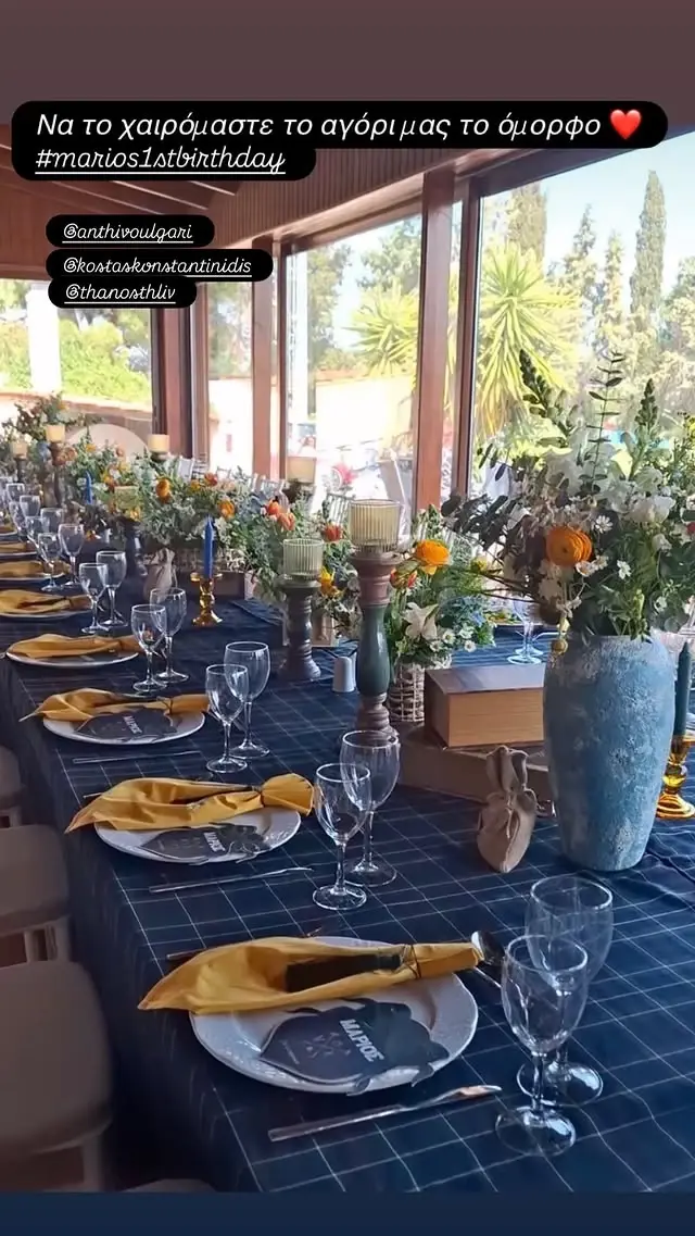 Ιδιαίτερα προσεγμένη ήταν και η μεγάλη τραπεζαρία, που είχε στηθεί για τους καλεσμένους. Το μπλε καρό τραπεζομάντιλο, οι πλούσιες ανθοδέσμες και τα κεριά συνέθεταν μια κομψή και ζεστή ατμόσφαιρα. Κάθε θέση στο τραπέζι είχε τοποθετηθεί με ιδιαίτερη φροντίδα, καθώς πάνω στα πιάτα υπήρχαν κίτρινες πετσέτες αλλά και μικρά διακοσμητικά στοιχεία με το όνομα του μικρού Μάριου, προσδίδοντας μια πιο προσωπική και τρυφερή πινελιά στη διακόσμηση.